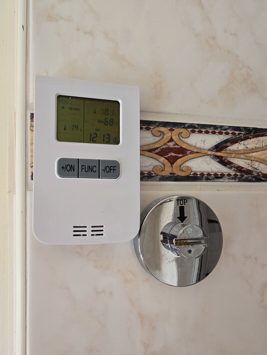 Im Badezimmer sorgt ein Handtuchheizkörper für angenehme Wärme. Die dazugehörige Regelung finden Sie direkt oberhalb des Heizkörpers und können ihn dort bequem per „On“-„Off“-Schalter ein- und ausschalten.