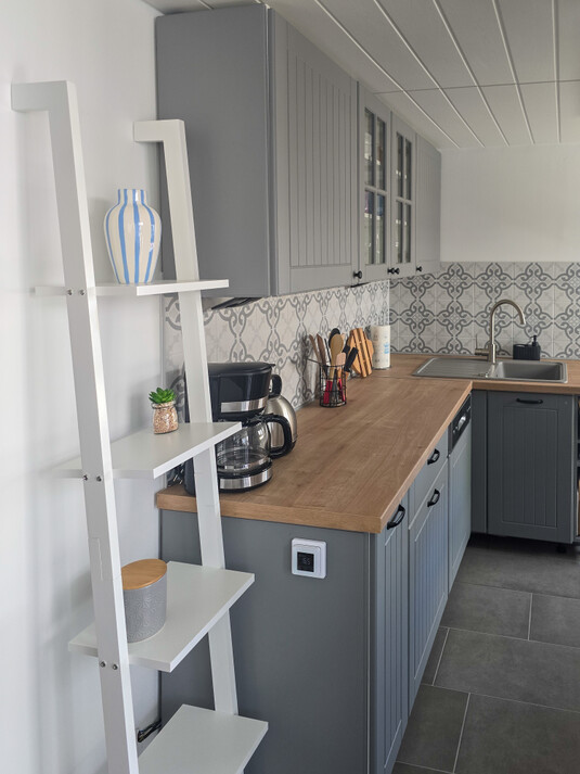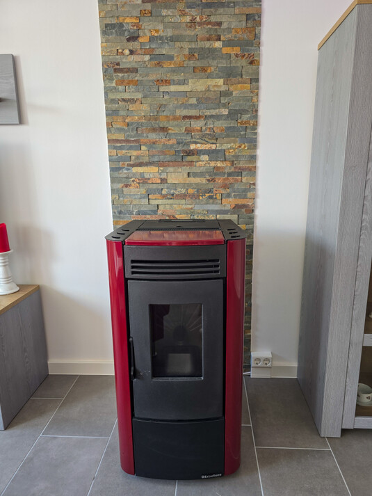 Im Zentrum des Wohnbereichs steht der stilvolle, rote Pelletofen – die Hauptquelle für wohlige Wärme im Haus. Bitte beachten Sie: Der Pelletofen ist ein neues Modell und aktuell noch nicht angeschlossen – wir arbeiten daran, ihn bald einsatzbereit zu machen. Für die Übergangszeit steht Ihnen daher ein Elektroheizkörper zur Verfügung.